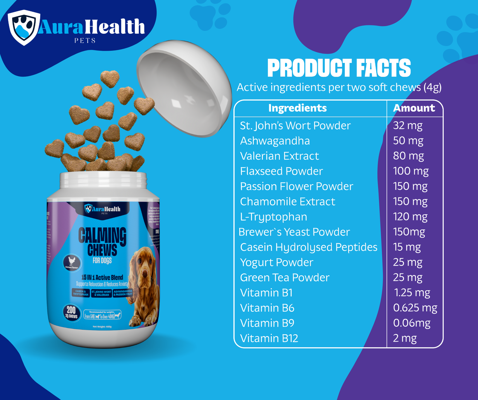 With up to a 4-month supply in one pack, Aurahealth ensures lasting care for your pet. Each chew is packed with natural and dog-friendly ingredients known for their calming effects—like chamomile, L-theanine, and valerian root. These synergistic components work together to reduce stress and encourage relaxation without sedating your dog. Plus, they’re easy to administer—perfect for busy pet parents! The chews not only target behavior but also contribute to overall wellness, supporting your dog’s adjustment during trips, loud noises, vet visits, or changes in routine.