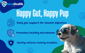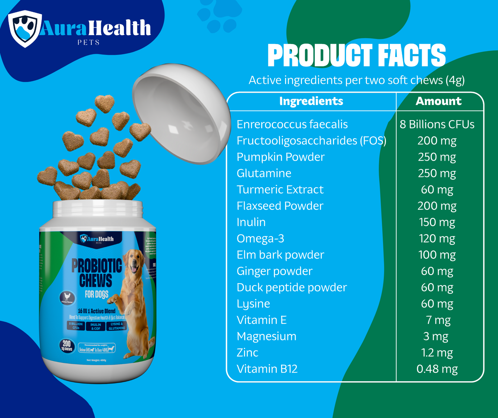 Crafted by AuraHealth with a 16-in-1 advanced formula that supports digestive balance, immune health, and overall vitality in dogs of all sizes Delivers 16 billion CFU of Enterococcus faecalis per serving, a scientifically backed probiotic that helps restore healthy gut flora, reduce bloating, and support regular bowel movements Powered by prebiotics FOS and inulin, which feed beneficial bacteria in the gut to improve nutrient absorption, strengthen digestive resilience, and reduce harmful bacteria Includes pumpkin, flaxseed, and ginger—natural sources of fiber and antioxidants—to soothe upset stomachs, ease constipation or diarrhea, and reduce gas and bloating Enriched with omega-3 from flaxseed oil…