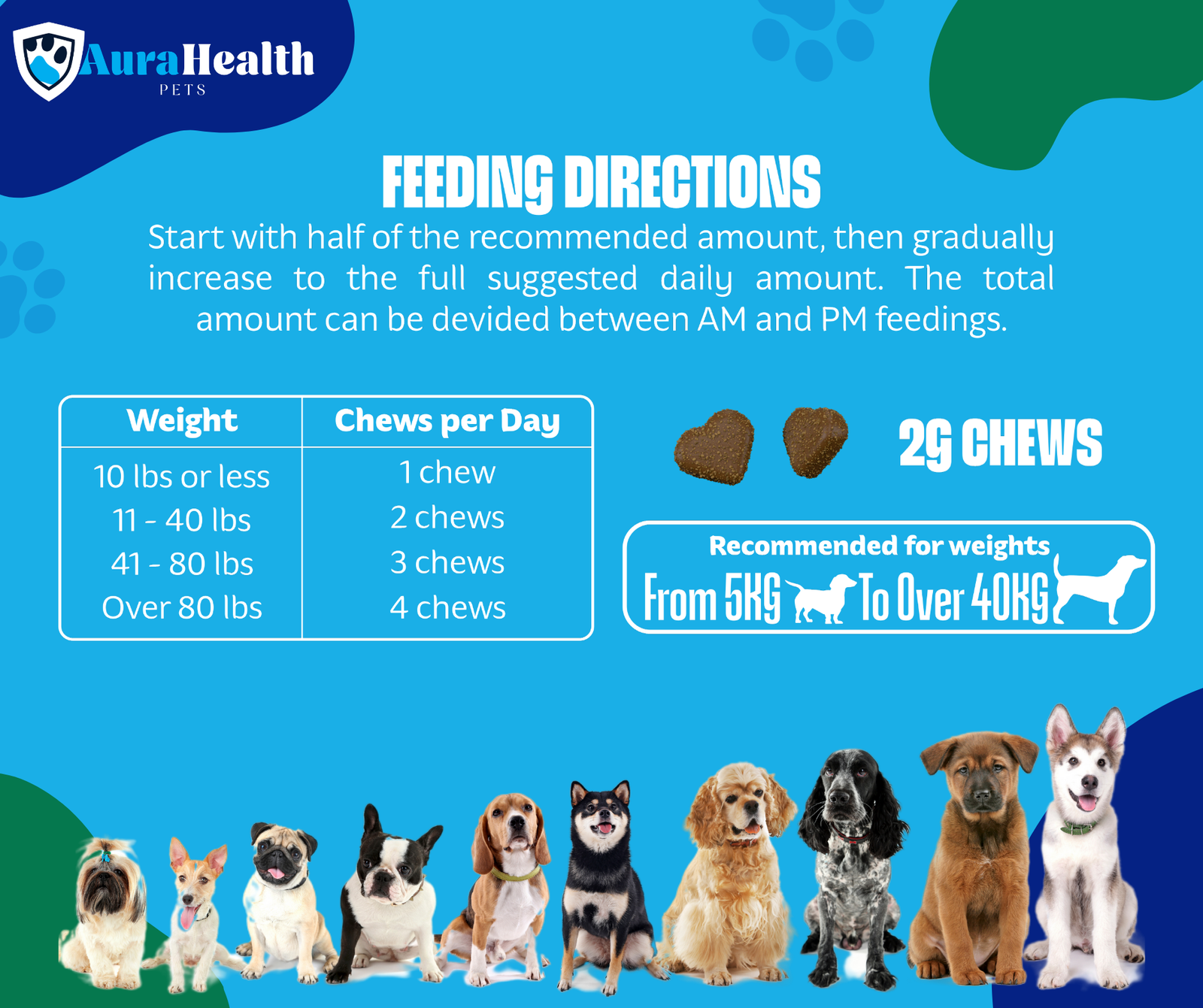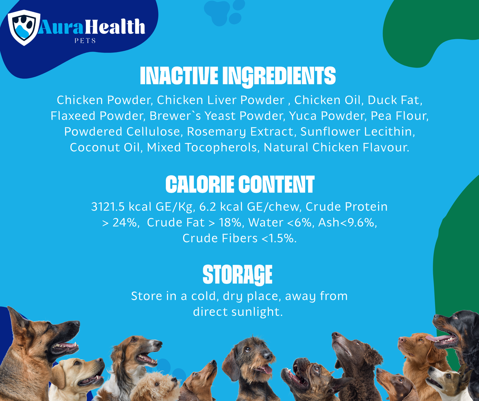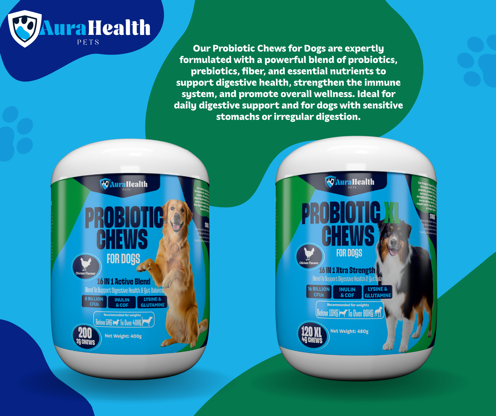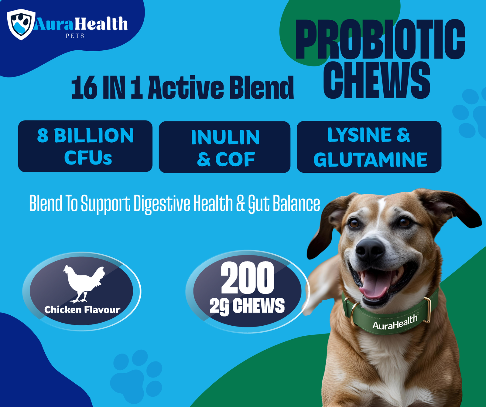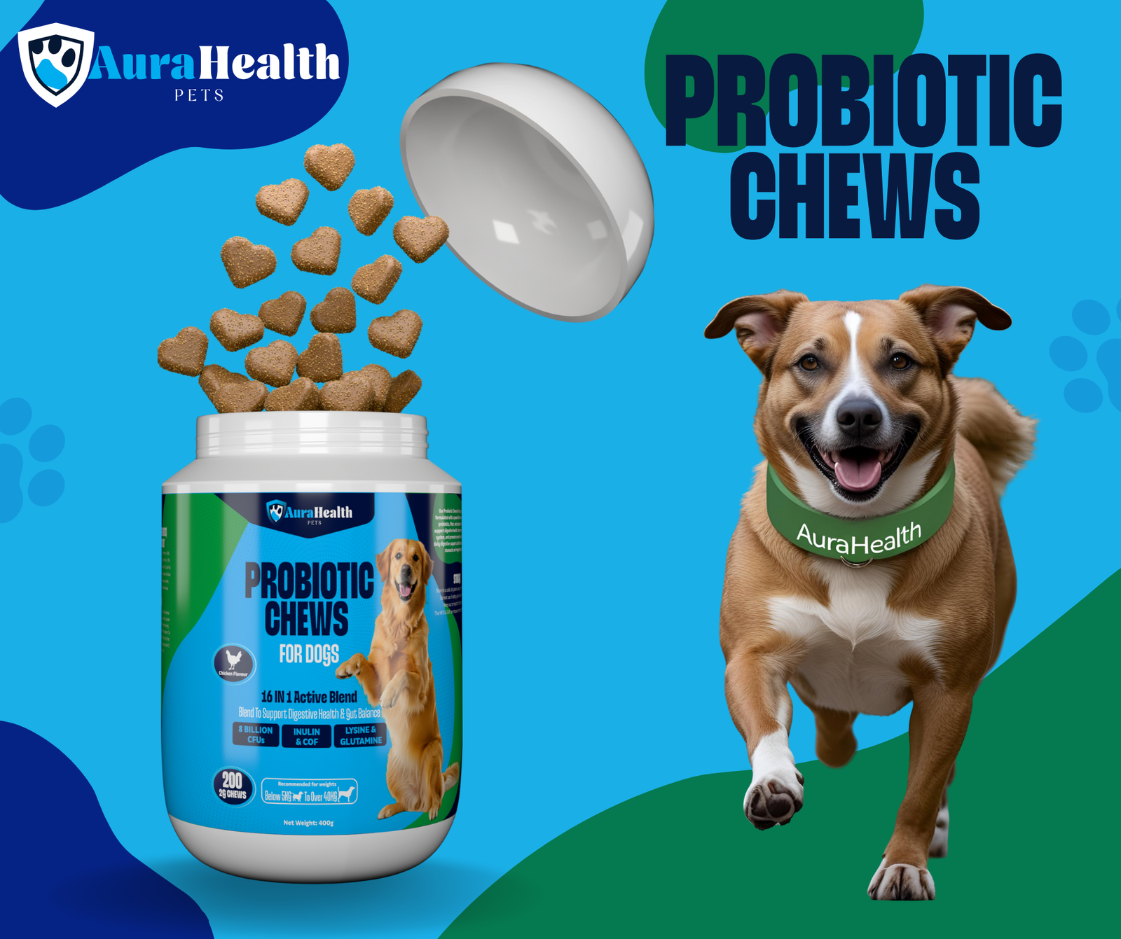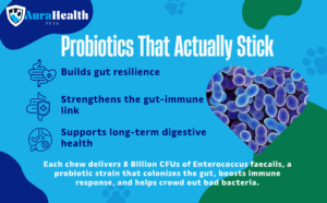 Support your dog’s digestive health and immune system with AuraHealth Probiotic Chews — expertly crafted for daily gut balance, overall wellness, and a shiny coat. Each serving delivers 8 Billion CFUs of Enterococcus faecalis, a well-researched probiotic strain that promotes healthy digestion and stool quality.
